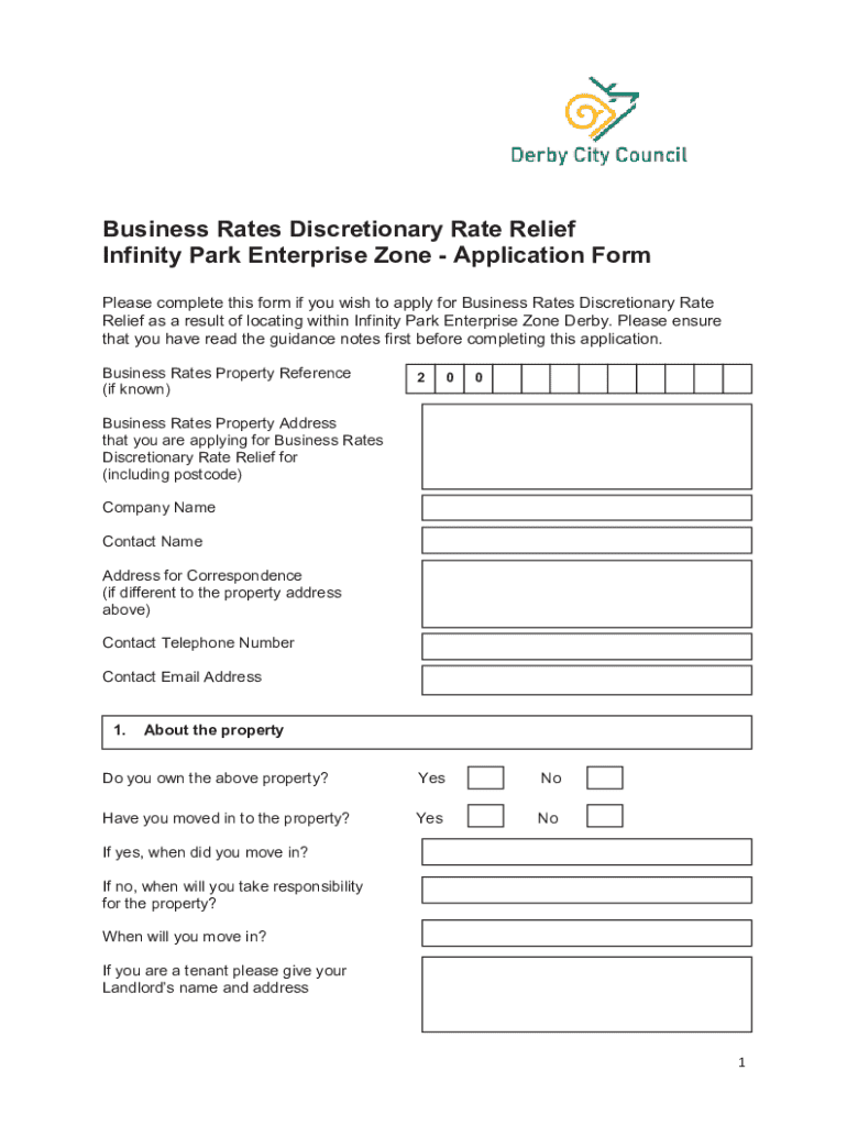 This form is used to apply for Business Rates Discretionary Rate Relief for businesses located within the Infinity Park Enterprise Zone, Derby. Applicants must read the guidance notes before completing