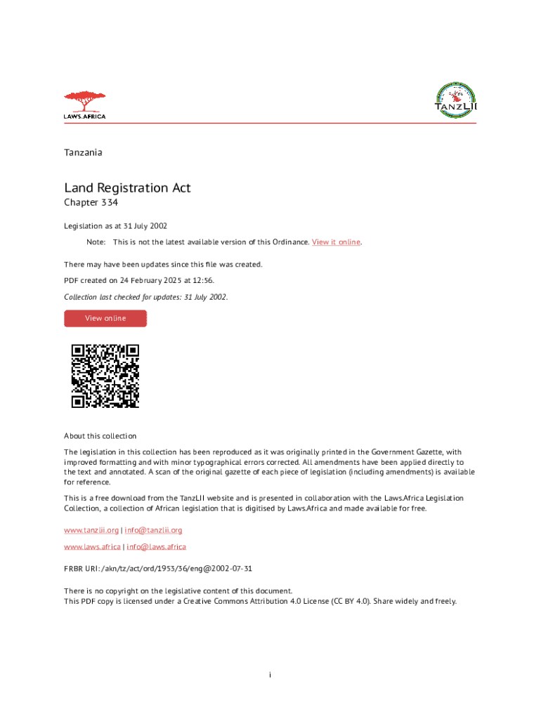 TanzaniaLand Registration Act Chapter 334 Legislation as at 31 July 2002 Note: This is not the latest available version of this Ordinance. View it online. There may have been updates since this le