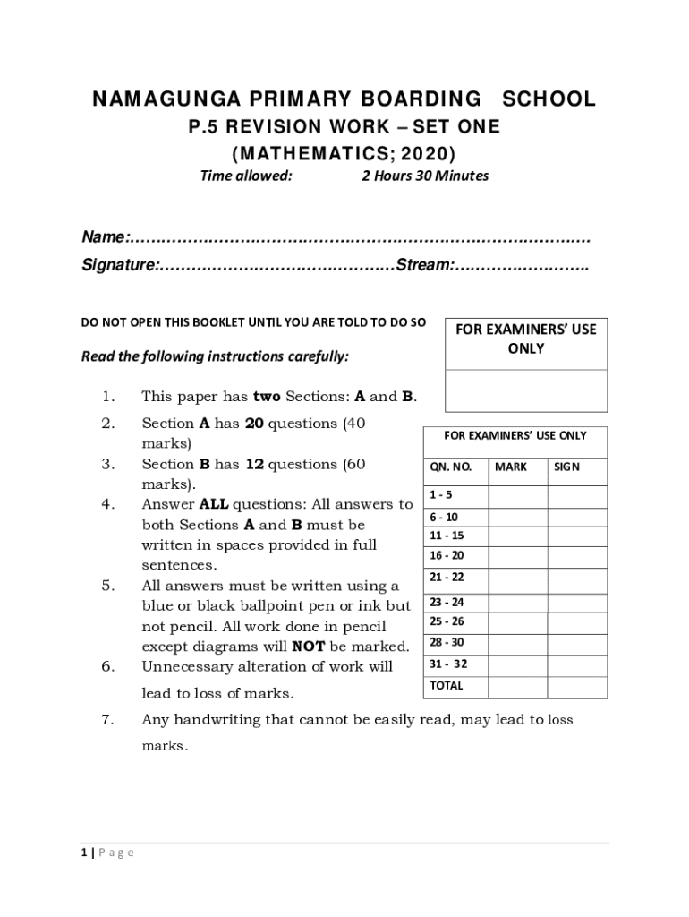 This document is a revision work set for Primary 5 Mathematics students at Namagunga Primary Boarding School. It consists of two sections with various mathematical problems that students are required