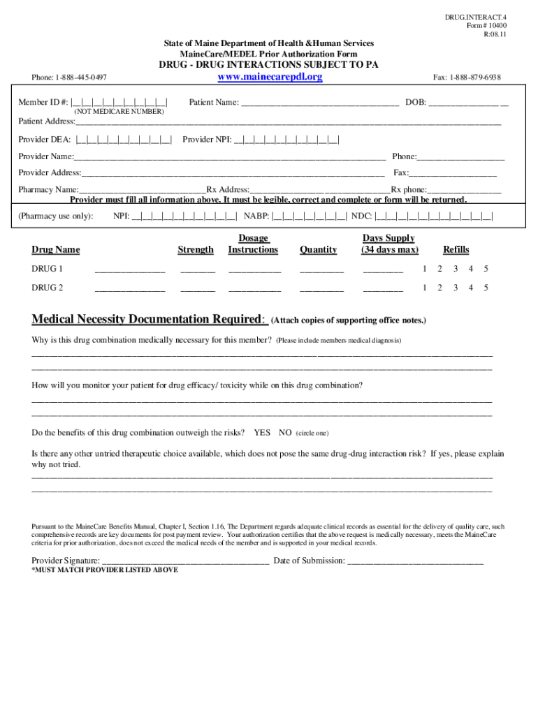 This form is used for prior authorization of drug-drug interactions under MaineCare. It includes sections for patient information, provider information, drug details, and medical necessity documentation.