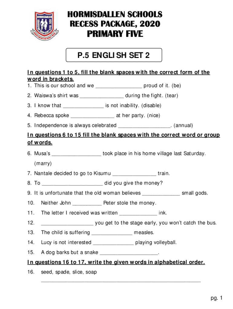 This document contains a series of English language exercises designed for Primary Five students. It includes fill-in-the-blank questions, rephrasing sentences, vocabulary tasks, and reading comprehension,