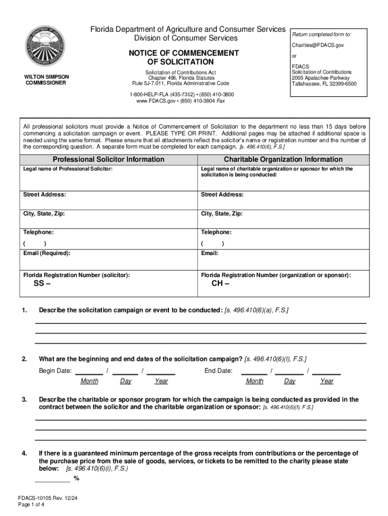 This form is used to notify the Florida Department of Agriculture and Consumer Services about the commencement of a solicitation campaign or event for charitable contributions, as mandated by the