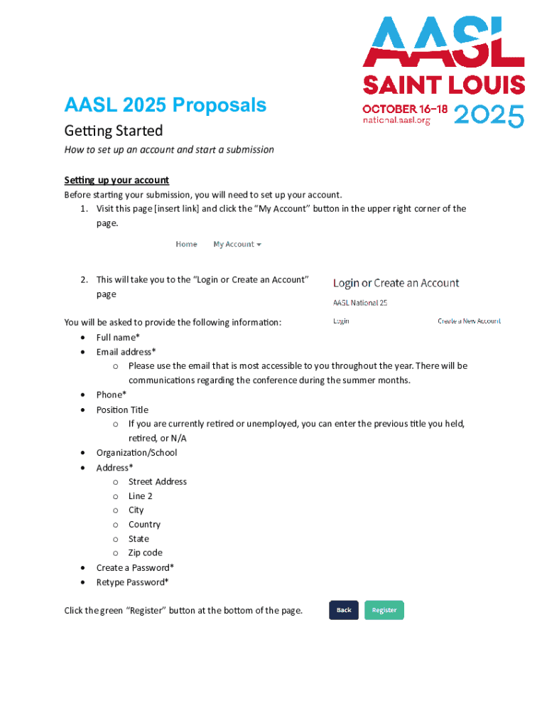This document outlines the process for setting up an account and submitting proposals for the AASL 2025 National Conference, including detailed instructions for completing proposal forms and important