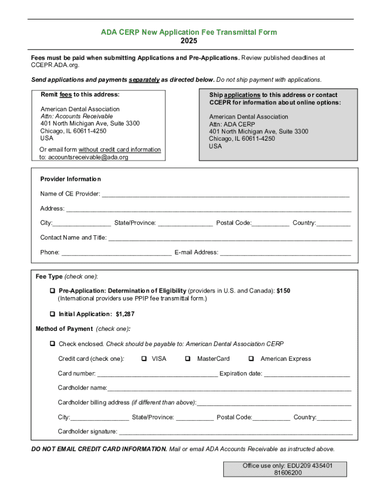 This form is used to submit applications and payments for the ADA CERP application process. It includes sections for provider information, fee type selection, and payment method.