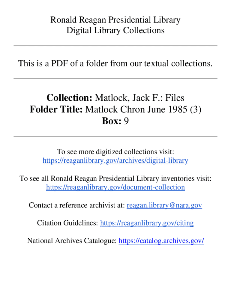 Ronald Reagan Presidential Library Digital Library CollectionsThis is a PDF of a folder from our textual collections.Collection: Matlock, Jack F.: Files Folder Title: Matlock Chron June 1985 (3) Box: