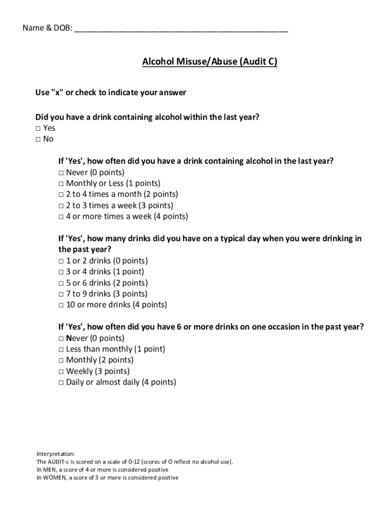 Name & DOB: ___Alcohol Misuse/Abuse (Audit C) Use \"x\" or check to indicate your answer Did you have a drink containing alcohol within the last year? Yes No If \'Yes\', how often did you have a drink