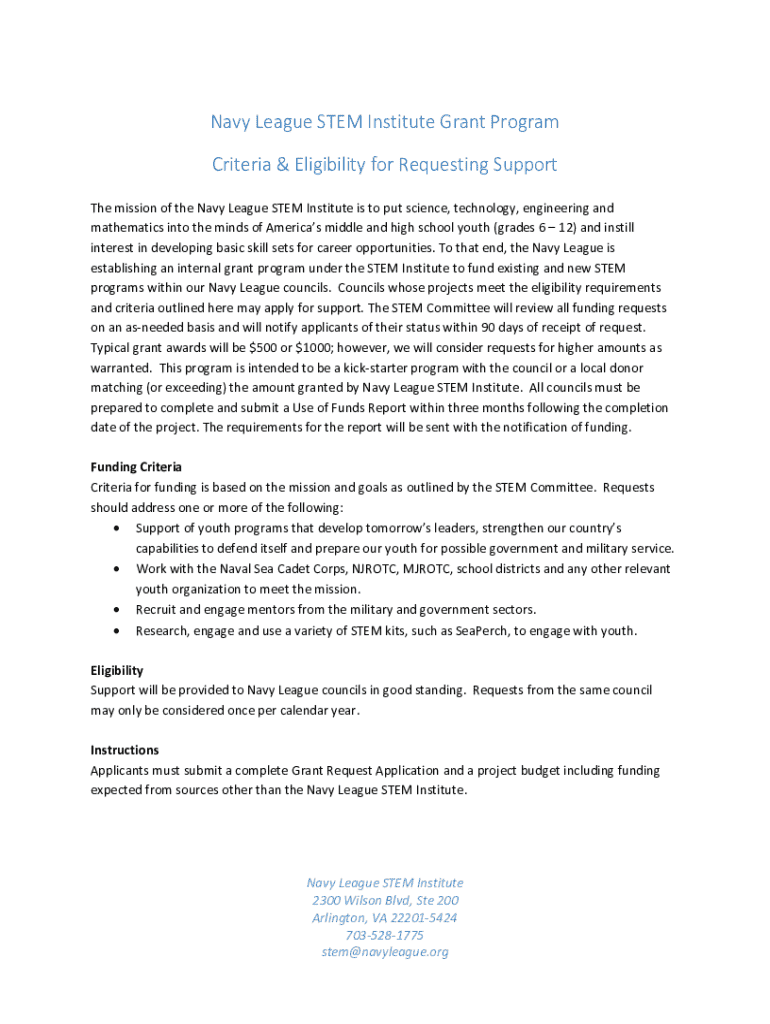 Applications for support from the Navy League STEM Institute are accepted on a year-round basis. This grant program aims to fund existing and new STEM programs within Navy League councils, focusing