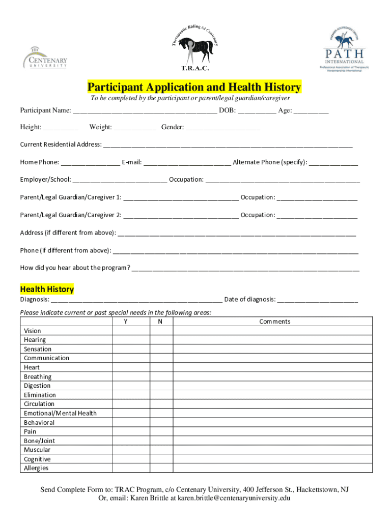 This document collects detailed information about the participant including personal information, health history, medication, and emergency contact details for the TRAC program at Centenary University.