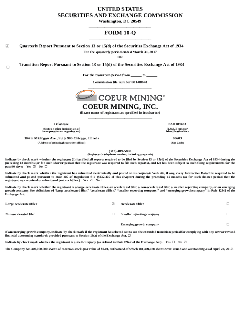 This quarterly report provides detailed financial information, management discussion and analysis of operations for Coeur Mining, Inc. for the period ending March 31, 2017. It includes Unaudited Condensed