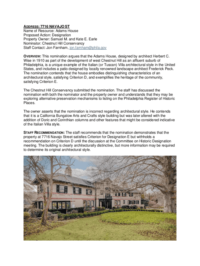 ADDRESS: 7716 NAVAJO ST Name of Resource: Adams House Proposed Action: Designation Property Owner: Samuel M. and Kate E. Earle Nominator: Chestnut Hill Conservancy Staff Contact: Jon Farnham, jon.farnham@phila.gov