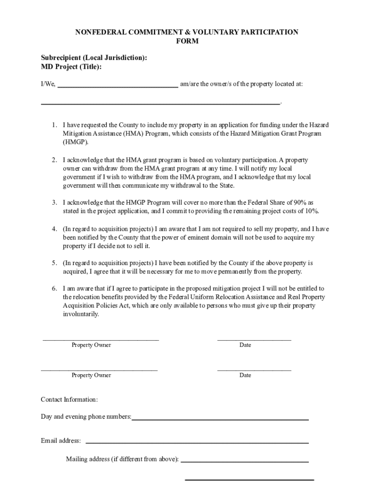 This form is used by property owners to acknowledge their participation in the Hazard Mitigation Assistance (HMA) Program and their commitment to the associated funding requirements. It details the
