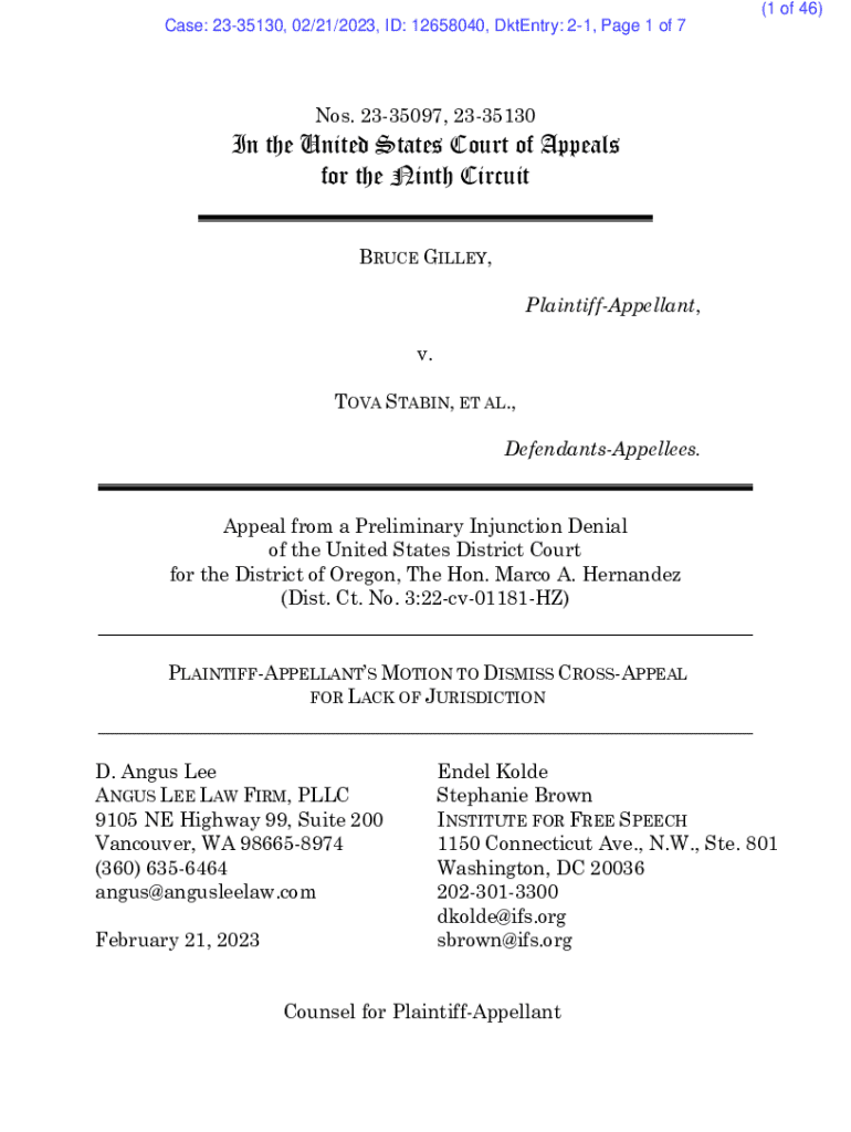 (1 of 46) Case: 2335130, 02/21/2023, ID: 12658040, DktEntry: 21, Page 1 of 7Nos. 2335097, 2335130In the United States Court of Appeals for the Ninth Circuit BRUCE GILLEY, PlaintiffAppellant, v. TOVA