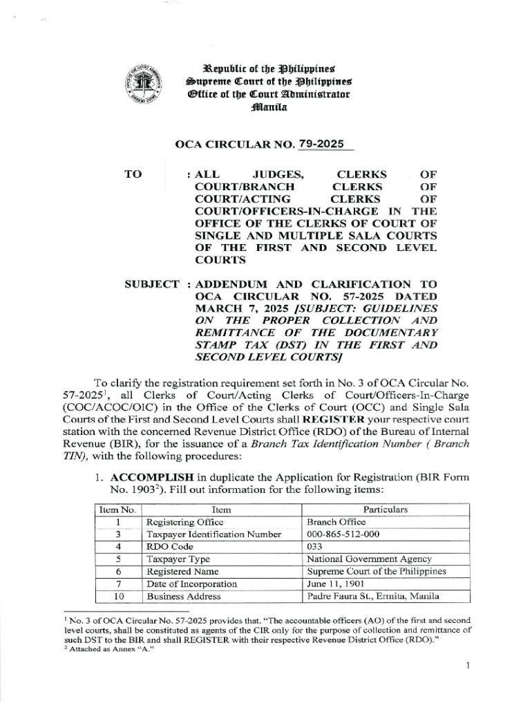 This circular provides guidelines for clerks of court on the registration requirements for collecting and remitting Documentary Stamp Tax (DST) in first and second level courts, including procedures