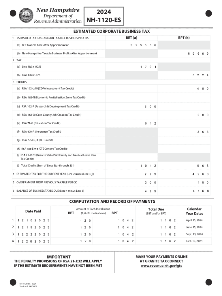 Corporations that expect to owe more than a certain amount in New Hampshire business profits tax are required to file NH-1120-ES.
