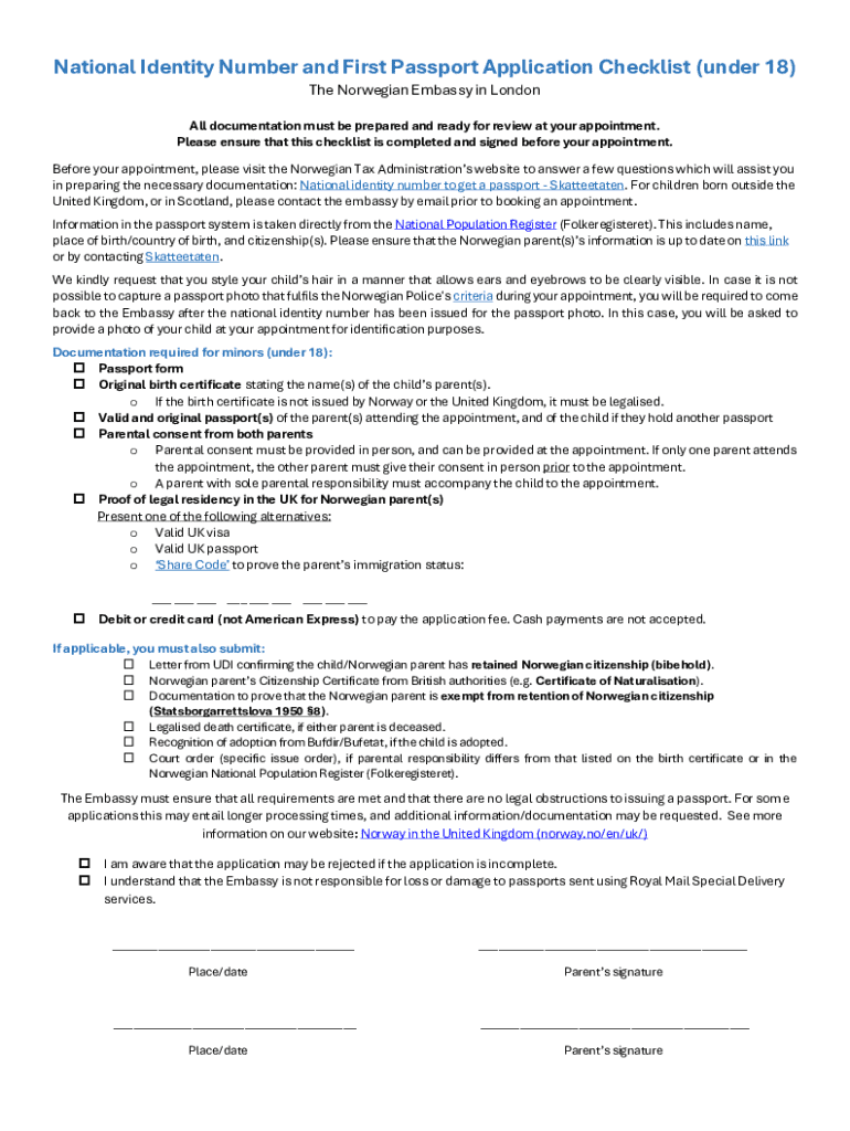 This checklist outlines the necessary documentation and requirements for applying for a national identity number and first passport for minors under 18 at the Norwegian Embassy in London. It includes
