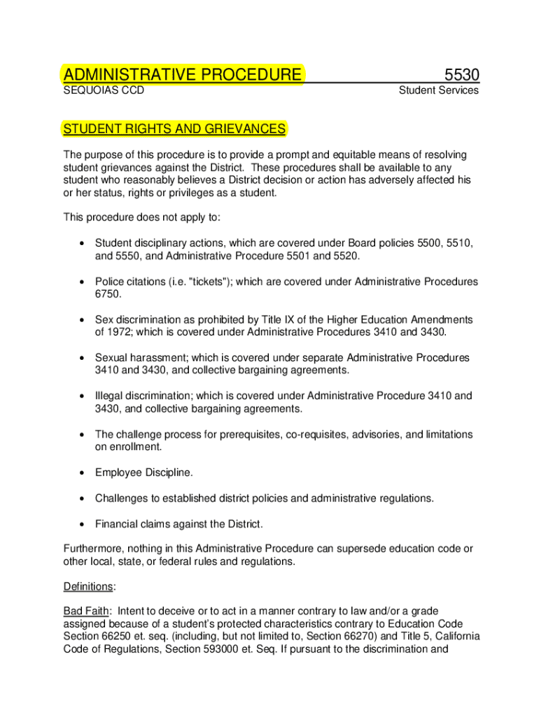 El procedimiento administrativo 5530 proporciona un medio rápido y equitativo para resolver las quejas de los estudiantes contra el Distrito. Estas normas están disponibles para cualquier estudiante