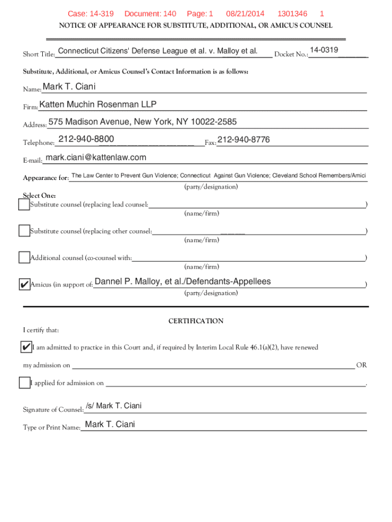 This document serves as a formal notice of appearance for substitute, additional, or amicus counsel in the case of Connecticut Citizens\' Defense League et al. v. Malloy, including the certification