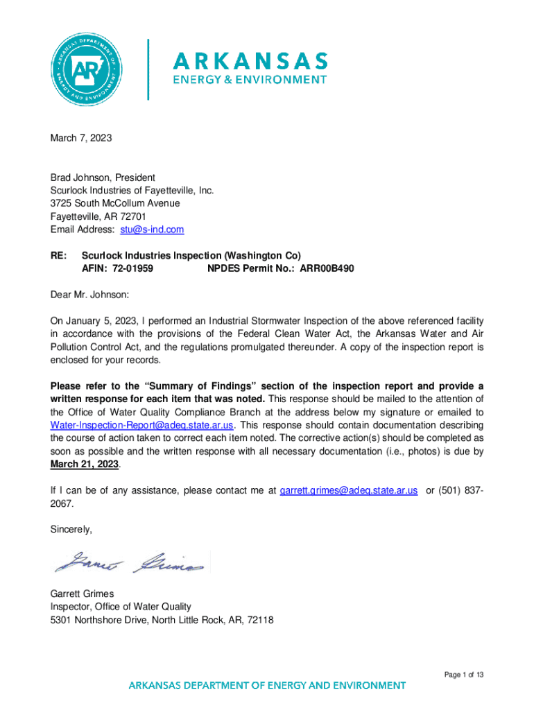 March 7, 2023Brad Johnson, President Scurlock Industries of Fayetteville, Inc. 3725 South McCollum Avenue Fayetteville, AR 72701 Email Address: stu@sind.com RE:Scurlock Industries Inspection (Washington