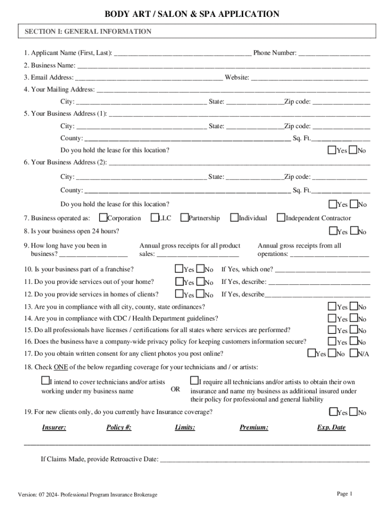 Application form for body art, salon, and spa services that collects information about the applicant, their business, services offered, and compliance with regulations. The application includes sections