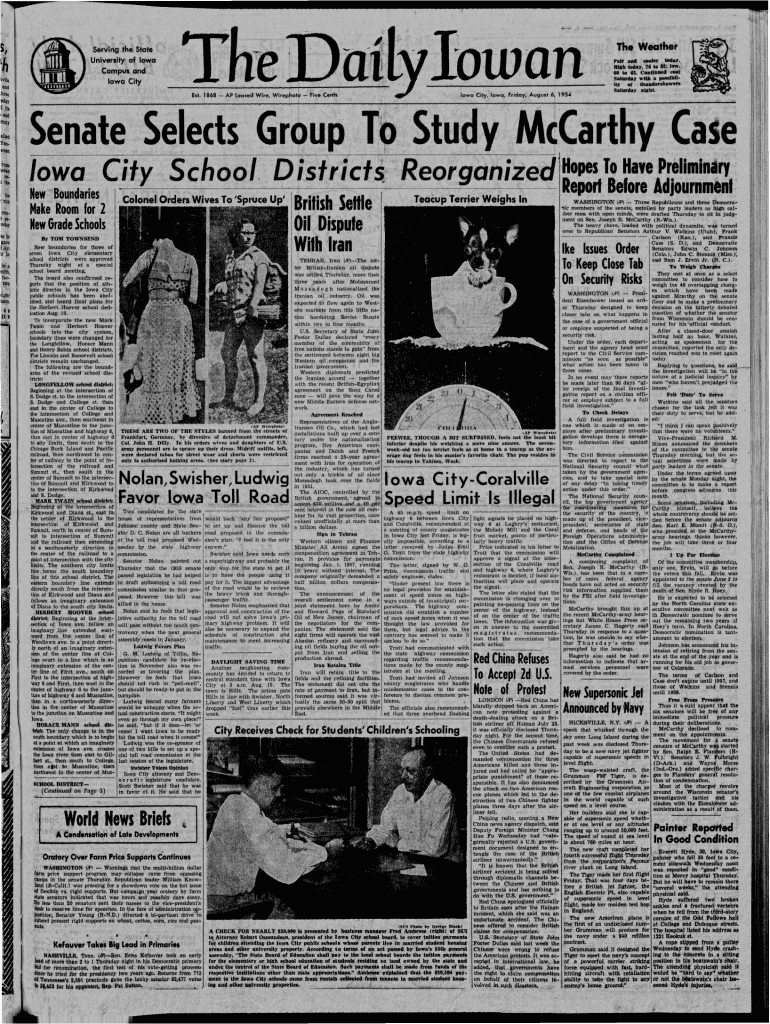 5, hServing the State Univerlity of Iowa Campul and Iowa Cityowan Iowa City. Iowa. friday, August 6, 1954Est. 1868 AP Leased Wire, Wirephoto Five CentsTh. WeatherSMa,.eMIer ,.FaIr ......... ,.IIIda