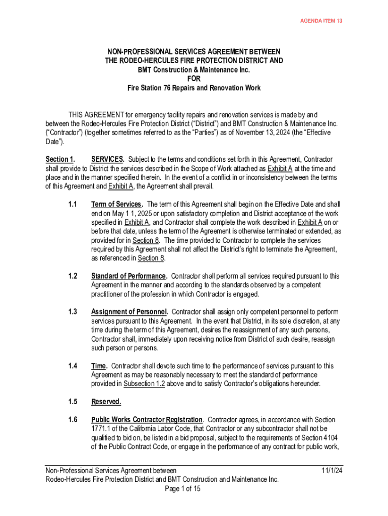AGENDA ITEM 13NONPROFESSIONAL SERVICES AGREEMENT BETWEEN THE RODEOHERCULES FIRE PROTECTION DISTRICT AND BMT Construction & Maintenance Inc. FOR Fire Station 76 Repairs and Renovation Work THIS AGREEMENT