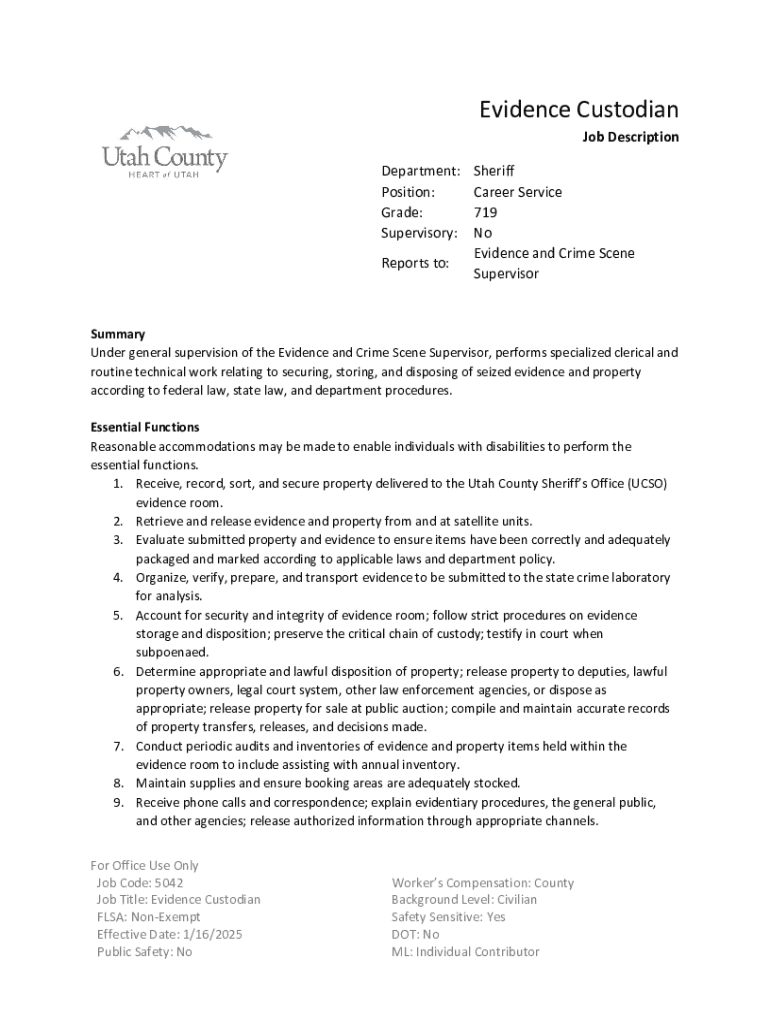 This job description outlines the responsibilities, qualifications, and work environment for the Evidence Custodian position at the Utah County Sheriff\'s Office. The role involves managing the receipt,