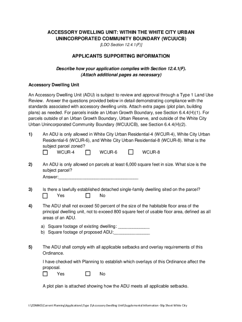 This document serves as an application form for the approval of an Accessory Dwelling Unit (ADU) in the designated zones of White City Urban Residential (WCUR-4, WCUR-6, WCUR-8). It requires detailed