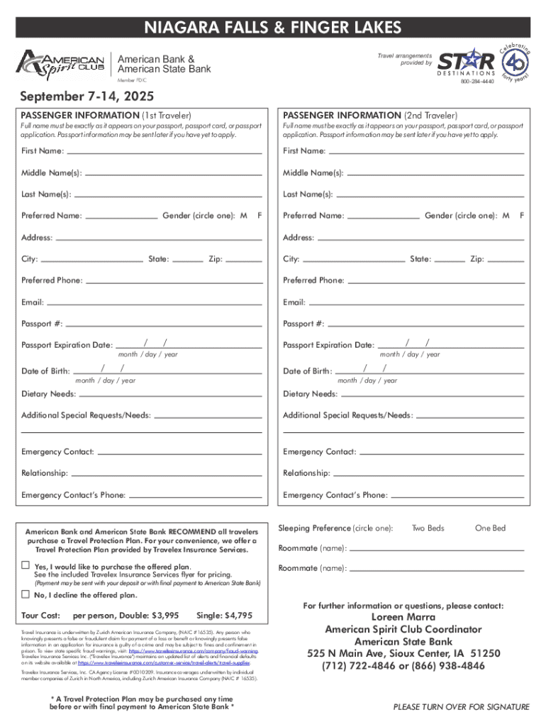 NIAGARA FALLS & FINGER LAKES Travel arrangements provided byAmerican Bank & American State Bank Member FDIC8002844440September 714, 2025 PASSENGER INFORMATION (1st Traveler)PASSENGER INFORMATION (2nd
