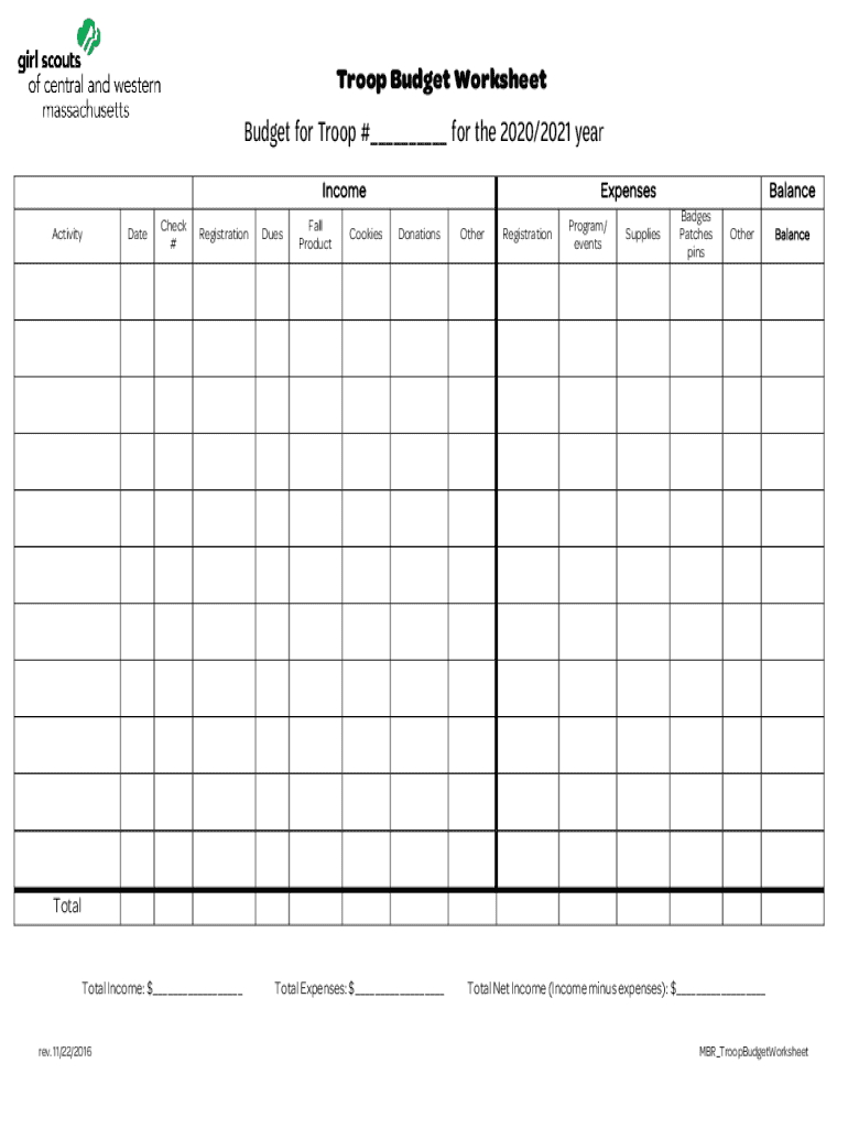 The troop budget worksheet is a financial document used by scout troops to plan and track their income and expenses over a given period.