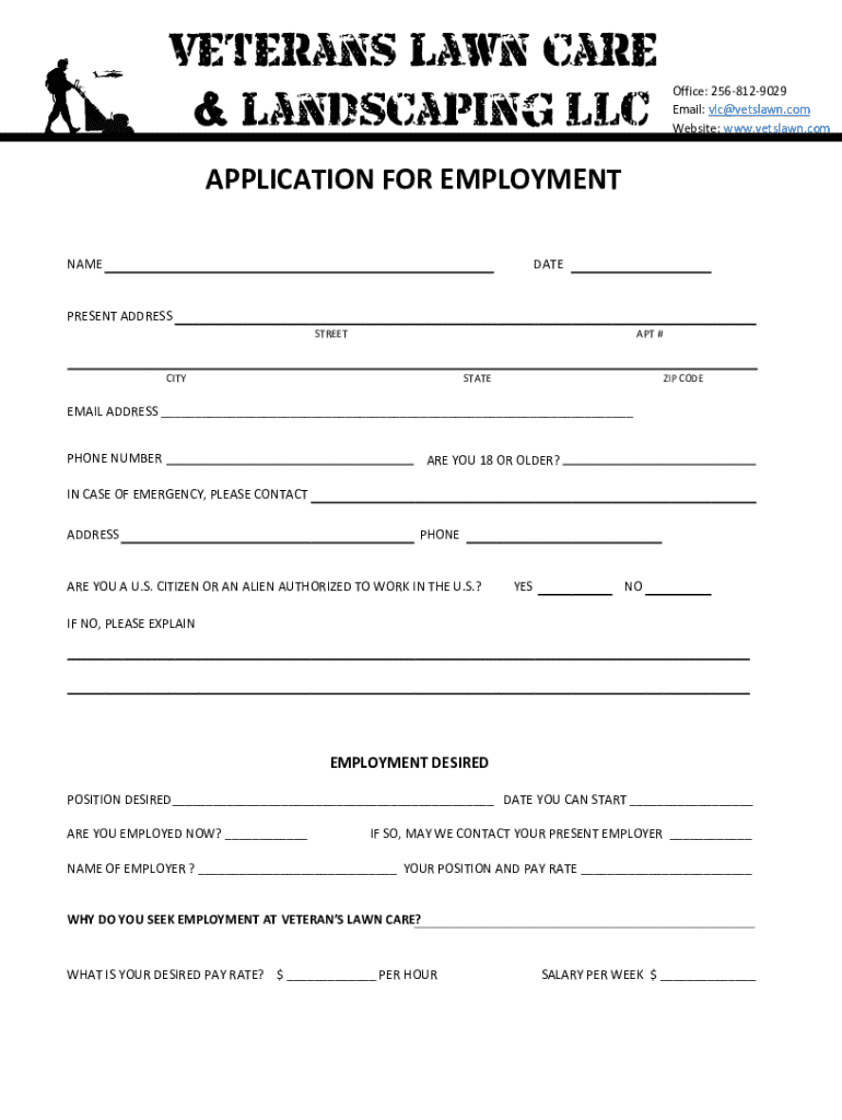 This document is an application for employment at Veterans Lawn Care & Landscaping LLC, gathering personal details, employment history, educational background, and other relevant information for potential