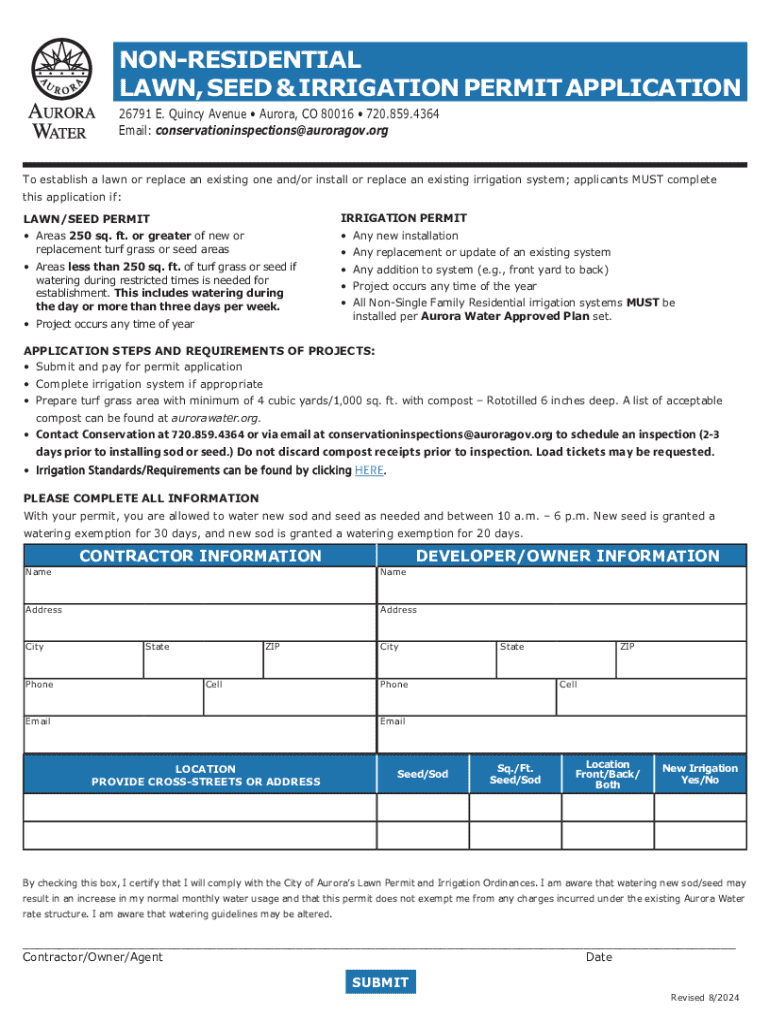 This application is required to establish a lawn or replace an existing one and/or install or replace an irrigation system for non-single family residential projects in Aurora, CO. It details the