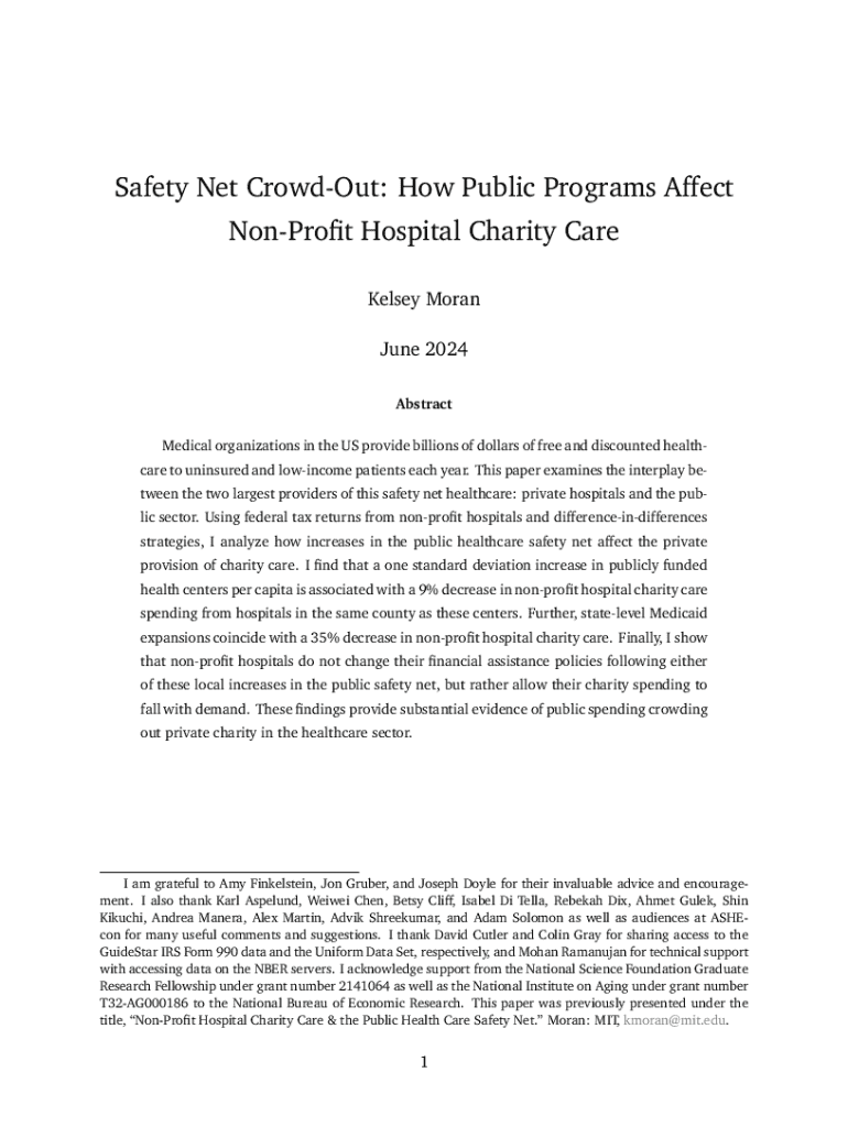 Safety Net CrowdOut: How Public Programs Affect NonProfit Hospital Charity Care Kelsey Moran June 2024 Abstract Medical organizations in the US provide billions of dollars of free and discounted healthcare