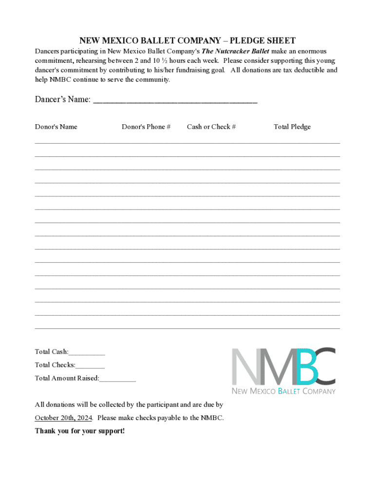 A pledge sheet for supporters to contribute to the fundraising goals of dancers participating in New Mexico Ballet Company\'s The Nutcracker Ballet, with all donations being tax deductible.