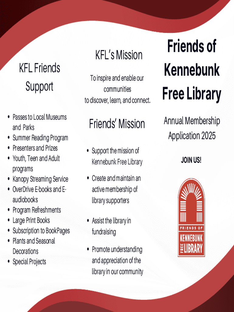 This document serves as an application for the annual membership to the Friends of Kennebunk Free Library, providing details on membership levels, benefits, and ways to support the library\'s programs