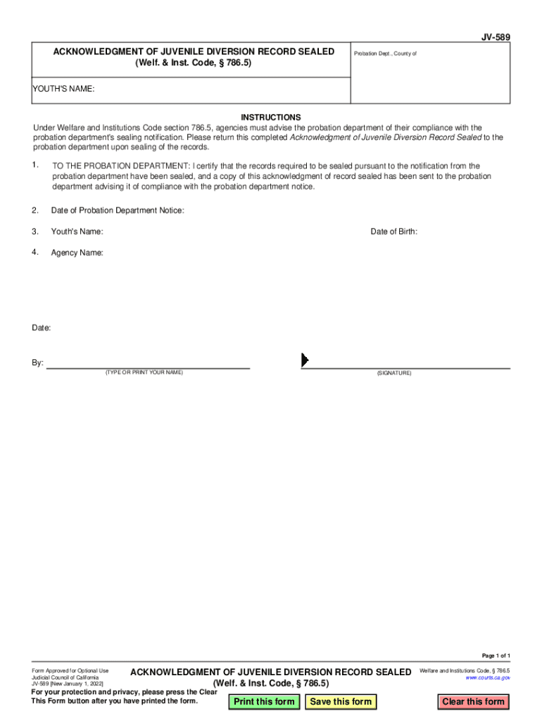 This form is used to acknowledge the sealing of juvenile diversion records in compliance with Welfare and Institutions Code section 786.5. It must be returned to the probation department after sealing
