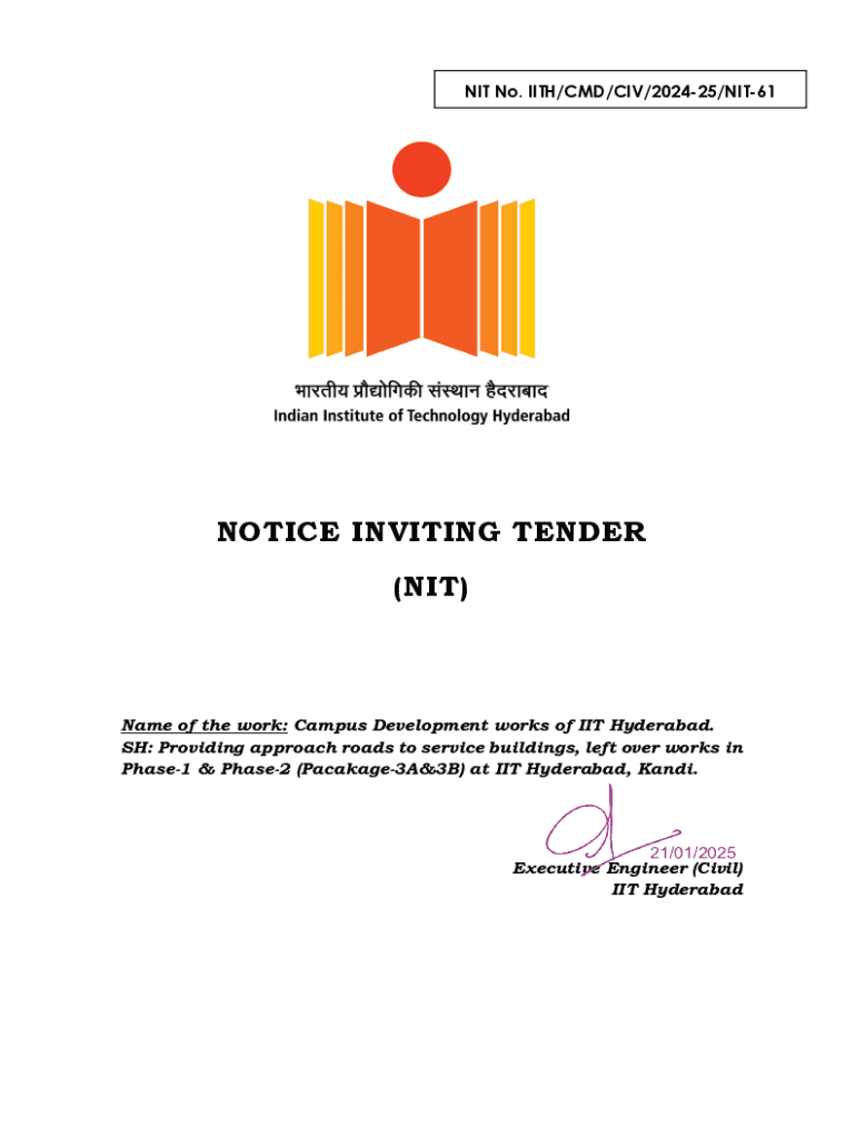 NIT No. IITH/CMD/CIV/202425/NIT61NOTICE INVITING TENDER (NIT)Name of the work: Campus Development works of IIT Hyderabad. SH: Providing approach roads to service buildings, left over works in Phase1