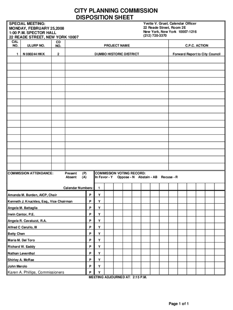 This document records the results of a special meeting held by the City Planning Commission regarding the Dumbo Historic District and includes attendance, voting records, and procedural rules.