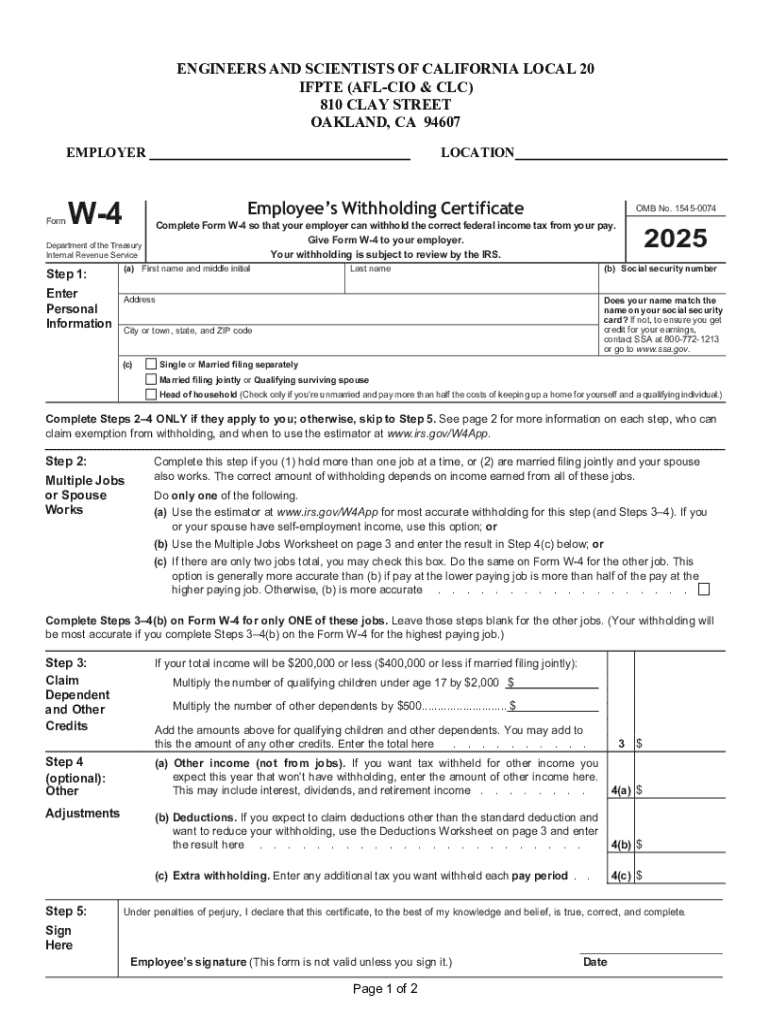 Complete Form W-4 so that your employer can withhold the correct federal income tax from your pay. Give Form W-4 to your employer. Your withholding is subject to review by the IRS.