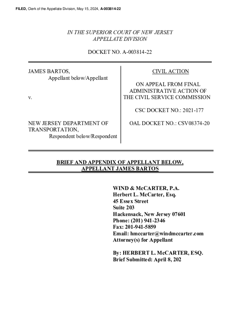 FILED, Clerk of the Appellate Division, May 15, 2024, A00381422IN THE SUPERIOR COURT OF NEW JERSEY APPELLATE DIVISION DOCKET NO. A00381422JAMES BARTOS, Appellant below/AppellantCIVIL ACTION ON APPEAL