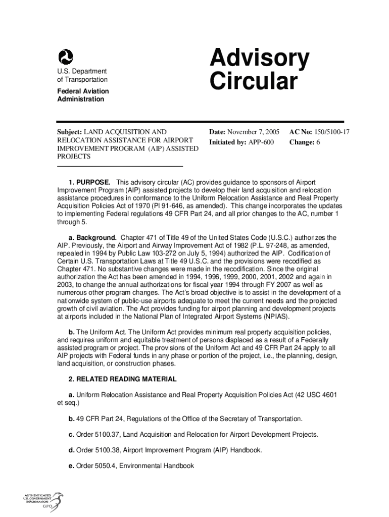 This advisory circular provides guidance to sponsors of Airport Improvement Program (AIP) assisted projects on land acquisition and relocation assistance procedures in accordance with the Uniform
