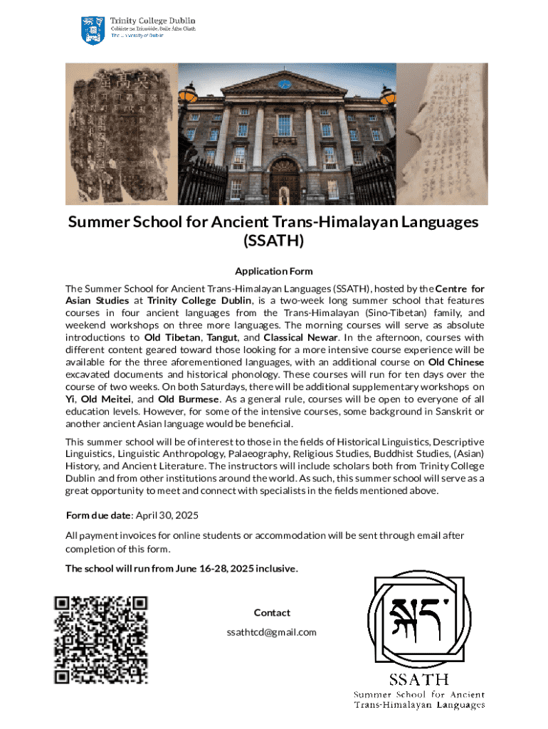 The Summer School for Ancient Trans-Himalayan Languages (SSATH) is a two-week program offering courses in Old Tibetan, Tangut, and Classical Newar, along with workshops on Yi, Old Meitei, and Old