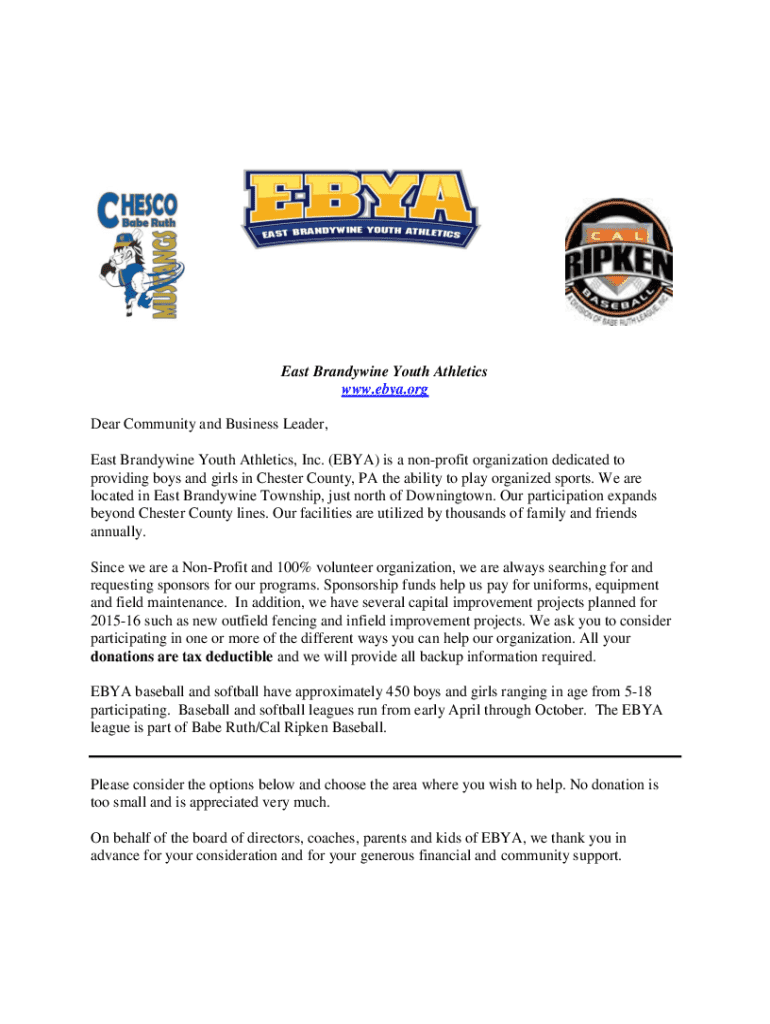 This document outlines the sponsorship opportunities available for East Brandywine Youth Athletics, including details about field sponsorship, scoreboard sponsorship, and different levels of sponsorship
