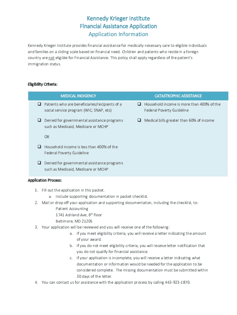 This application provides a means for individuals and families to apply for financial assistance for medically necessary care at the Kennedy Krieger Institute, based on financial need. It outlines
