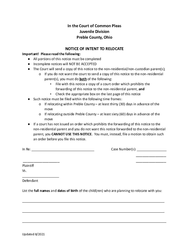 This document is a notice that must be submitted to the Court of Common Pleas, Juvenile Division in Preble County, Ohio, indicating the intent to relocate with a child. It includes requirements for
