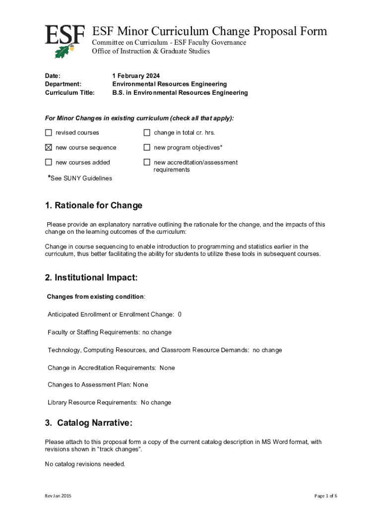 A proposal form for making minor changes in the existing curriculum of the Environmental Resources Engineering program at ESF, including adjustments in course sequencing and objectives to enhance