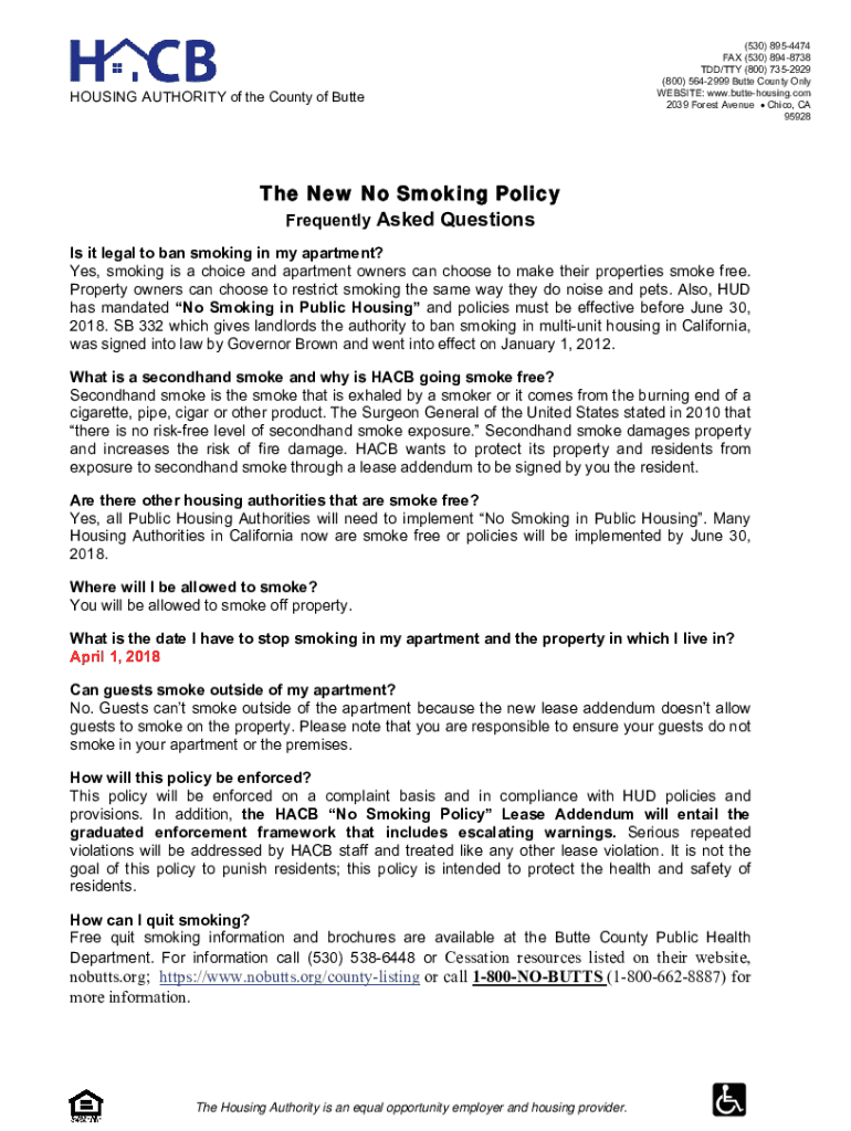 This document outlines the frequently asked questions regarding the No Smoking Policy implemented by the Housing Authority of the County of Butte, including legal aspects, reasons for going smoke-free,