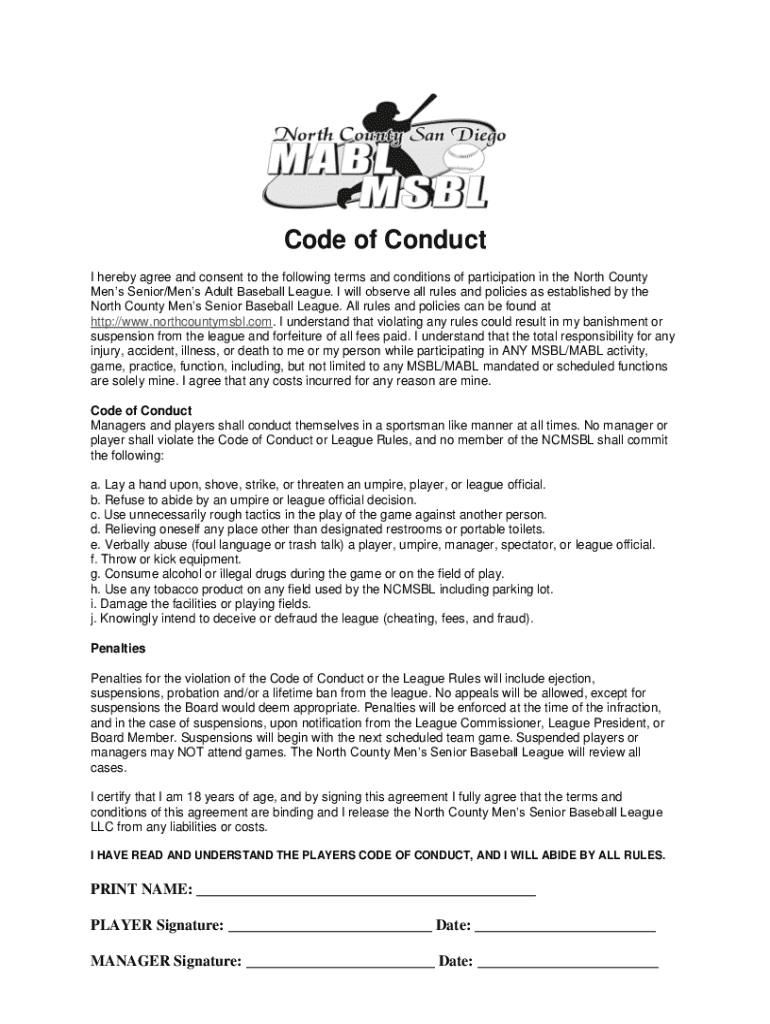 A formal agreement that outlines the terms and conditions of participation in the North County Men\'s Senior/Men\'s Adult Baseball League, including expectations for conduct, penalties for violations,