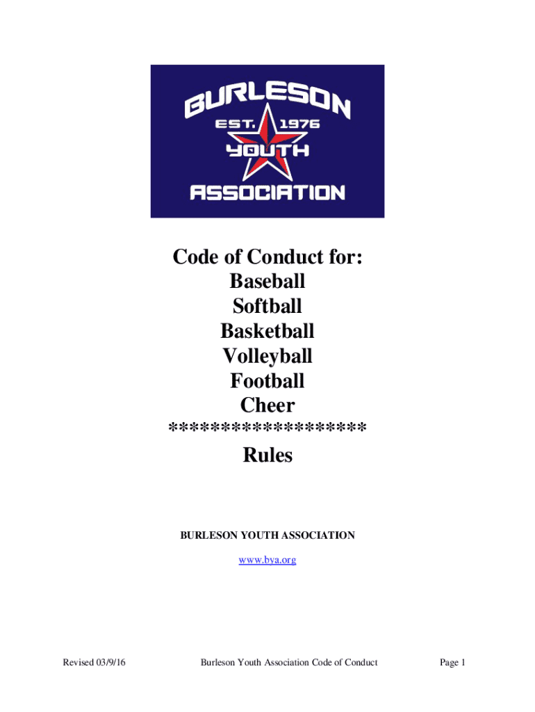 This document outlines the Code of Conduct for players, parents, and coaches associated with the Burleson Youth Association (BYA) sports, emphasizing sportsmanship, respect, and proper behavior during
