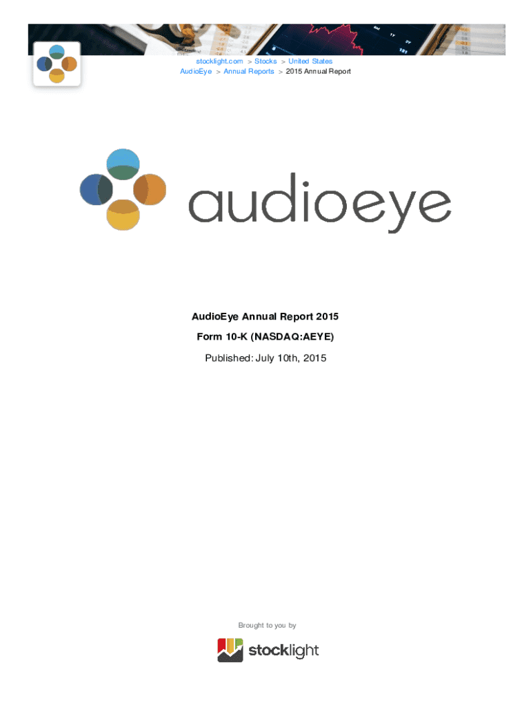 This document is the annual report of AudioEye, Inc. for the fiscal year ended December 31, 2014, detailing the company\'s business, financial performance, and compliance with accessibility standards.