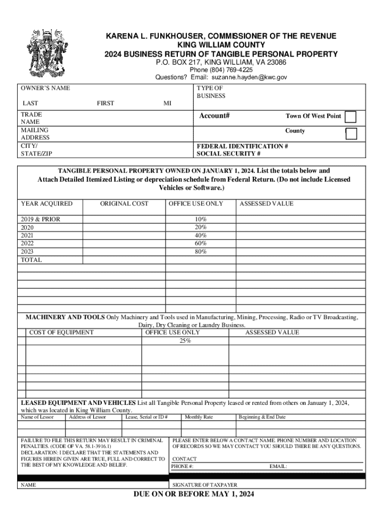 Este formulario debe ser completado por todas las personas o entidades que posean bienes tangibles en el Condado de King William al 1 de enero y que estén utilizando esos bienes en un comercio o